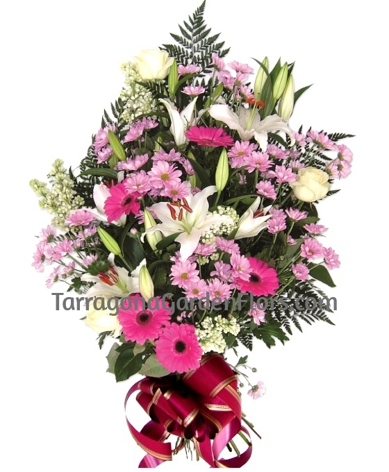 Bonito, de aire silvestre, este Ramo Funerario tonos Rosas para entregar en los Tanatorios de Tarragona. Es un ramo de defunción, de flores variadas, en tonos rosados, confeccionado con rosas, gerberas, margaritas, paniculata y verdes variados que le dan al ramo de flores para difuntos un aire primaveral y silvestre. Desde Floristería Garden Flors nuestros ramos de flores para difunto, se envían a todos los Tanatorios de Tarragona como muestra de cariño, aprecio y acompañamiento para la familia de la persona fallecida. Si quiere comprar flores para tanatorio o enviar flores al tanatorio puede optar a nuestro servicio de envíos florales fúnebres urgentes.